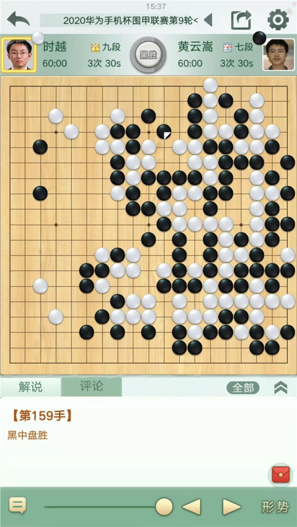 快棋臺由深圳宏發(fā)隊的時越九段執(zhí)白對陣江蘇隊的黃云嵩七段。開局一個局部黑棋應對欠妥,白方取得大優(yōu),然而時越之后的下法不夠簡明,被黑棋抓住了機會,局面變得混亂。在之后雙方大龍的接觸戰(zhàn)中,白方再次放棄簡明做活的下法,與黑棋大龍形成雙活,但結(jié)局是外圍厚薄損失慘重,白棋下成后手雙活之后無暇顧及下方大龍安危,被黑棋一舉擊潰。