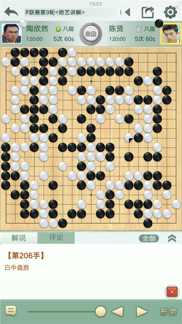 慢棋第一臺由深圳宏發(fā)隊的陶欣然八段執(zhí)白對陣江蘇隊的陳賢八段。雙方開局下出一個復雜的大型變化,局面一度兩分。序盤結(jié)束時陶欣然下出一步緩手,使得勝負的天秤向黑方傾斜。弈至官子階段,黑方下出了大意的敗招,單官沖斷白兩塊活棋,相當于自停一手,使得白棋追回不少目數(shù)。之后黑棋如繼續(xù)收官局面仍然細微,但陳賢在出現(xiàn)失誤后心態(tài)失衡,孤注一擲殺白大龍,最終失敗,白棋幸運獲勝。