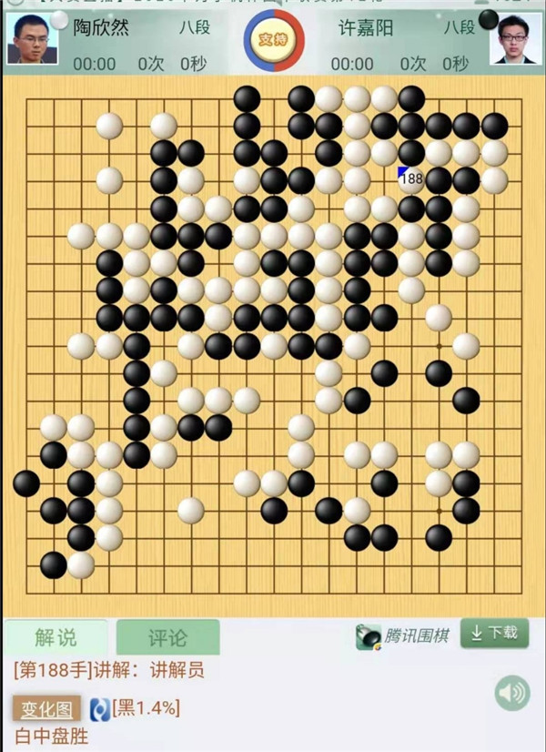 第一臺(tái)慢棋,由深圳隊(duì)的陶欣然八段執(zhí)白對(duì)陣江西隊(duì)的許嘉陽(yáng)八段。雙方開局平穩(wěn),中盤黑棋侵消左邊白棋大模樣時(shí)行棋過(guò)分,遭到白棋反擊后黑棋較為危險(xiǎn)。隨即作戰(zhàn)形成對(duì)殺,白棋沒(méi)有下出簡(jiǎn)明的快一氣變化,連續(xù)失誤后形成黑棋有利的劫爭(zhēng)。劫爭(zhēng)中黑棋卻出現(xiàn)嚴(yán)重失誤,由殺白變成了白棋便宜巨大的轉(zhuǎn)換,最終投子認(rèn)負(fù),陶欣然執(zhí)白中盤勝許嘉陽(yáng)。