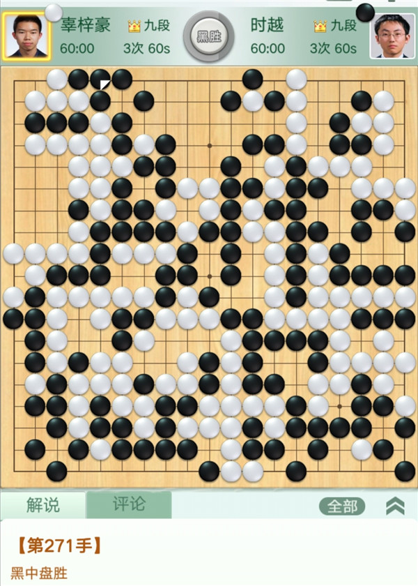 第四臺(tái)快棋,是兩位世界冠軍的對(duì)決,由深圳隊(duì)的時(shí)越九段執(zhí)黑快棋對(duì)陣江西隊(duì)的辜梓豪九段。開局至中盤雙方氣勢(shì)如虹,各自棄取,局面依然接近。之后黑棋下方定型失誤,白棋取得領(lǐng)先。在右下的劫爭(zhēng)中白棋判斷出現(xiàn)失誤,使黑棋扳回了局面。進(jìn)入官子階段,黑棋不顧中央隱患搶占右邊官子,白棋如果抓住機(jī)會(huì)在中央黑空出棋形成劫爭(zhēng)則局面復(fù)雜。實(shí)戰(zhàn)白棋沒(méi)敢開劫而是繼續(xù)收官,黑棋補(bǔ)棋后穩(wěn)固了勝勢(shì),時(shí)越執(zhí)黑中盤勝辜梓豪。