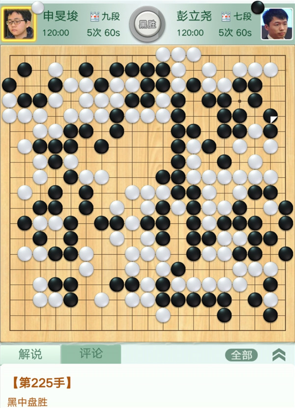 第三臺(tái)慢棋,由深圳隊(duì)外援申旻埈九段執(zhí)白對(duì)陣彭立堯七段。開局右邊黑棋行棋過(guò)分,但白棋對(duì)殺時(shí)出現(xiàn)較大失誤,將雙活走成被殺,黑棋大幅領(lǐng)先。之后黑棋右上角又出現(xiàn)失誤,將一塊棋送死,局面接近。上方作戰(zhàn)雙方都有一定的失誤,形勢(shì)劇烈波動(dòng),最終形成打劫。黑棋依仗劫材有利,放棄左上角將右上吃掉白棋棋筋活出,便宜巨大,獲得最終勝利,申旻埈執(zhí)白中盤負(fù)彭立堯。這一盤,教練羅洗河九段認(rèn)為“下得是真奇葩!”