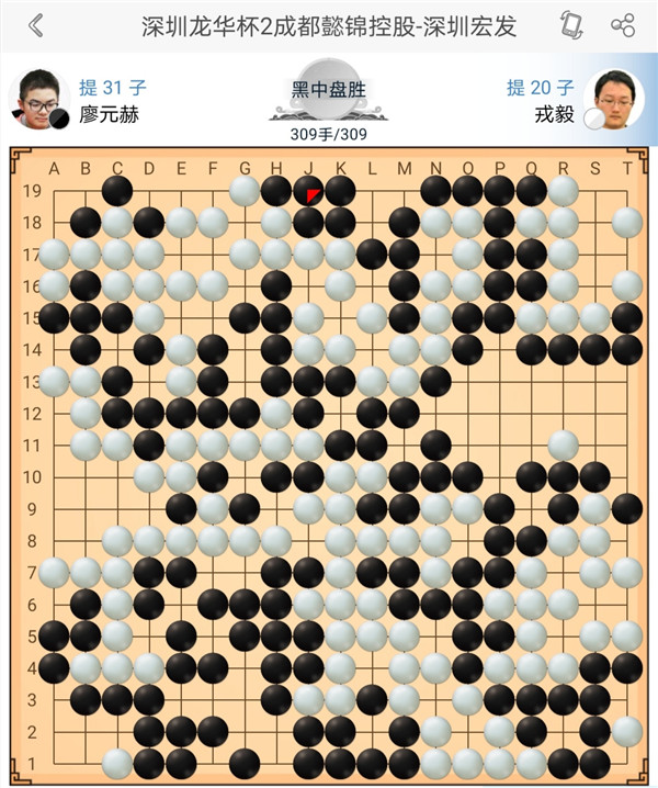 第三臺(tái)戎毅對(duì)陣廖元赫,開(kāi)局行至第30、32手時(shí)出現(xiàn)失誤,致一隊(duì)白子被殲。此后,雖一路奮力追趕,行至309手時(shí)依然無(wú)力回天,遂認(rèn)輸告負(fù)。
