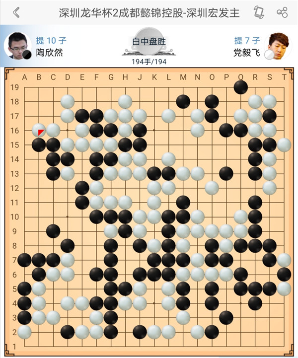第二臺(tái)主將陶欣然執(zhí)黑負(fù)于世界冠軍黨毅飛。中盤中腹作戰(zhàn)白棋失誤,轉(zhuǎn)換后黑棋優(yōu)勢(shì)。之后左上角黑棋行棋過(guò)分,被白棋抓住機(jī)會(huì)吃住上方四子后一舉奠定勝局。
