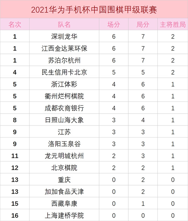 第二輪參賽各隊?wèi)?zhàn)況今天出現(xiàn)令人“驚奇”的一幕:四個4:0,兩個3:1。具體比分如下:北京棋院隊0:4浙江體彩隊;江西金達萊環(huán)保4:0西藏阜康隊;上海建橋?qū)W院隊0:4蘇泊爾杭州;洛陽隊0:4衢州隊;加加食品天津隊1:3江蘇隊;龍元明城杭州2:2主將勝日照山東大象隊;北京隊2:2成都隊;洛陽。截止目前,江西、蘇泊爾杭州、深圳龍華三隊積6分列第一,上海隊因0:4連輸兩場墊底。