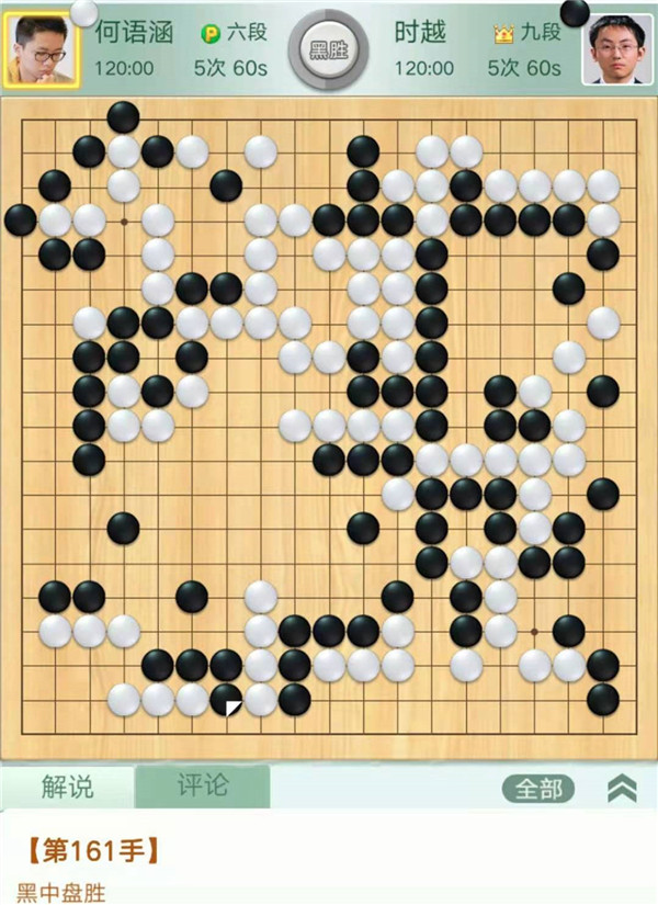 緊接著,一臺時越九段執(zhí)黑對何語涵六段干凈利落,時越在對局中充分發(fā)揮自身勢大力沉的棋風(fēng),以凌厲的屠龍刀法絕殺一條大龍,痛快淋漓地結(jié)束了戰(zhàn)斗。關(guān)鍵節(jié)點在中盤,黑棋對右邊白子簡單吃住尾巴則優(yōu)勢,實戰(zhàn)黑棋追求整體殺白,白棋應(yīng)對失誤大龍憤死,行棋161手。