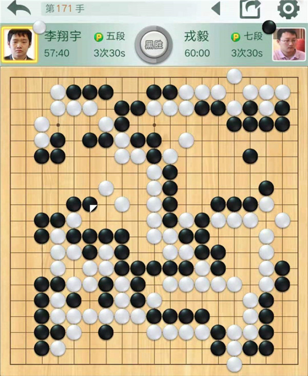 今日比賽中,三臺快棋戎毅執(zhí)黑對陣小將李翔宇,黑棋下方作戰(zhàn)失利早早進入敗勢。后來白棋中央突然將自己大龍走死,黑棋幸運獲勝,行棋171手。