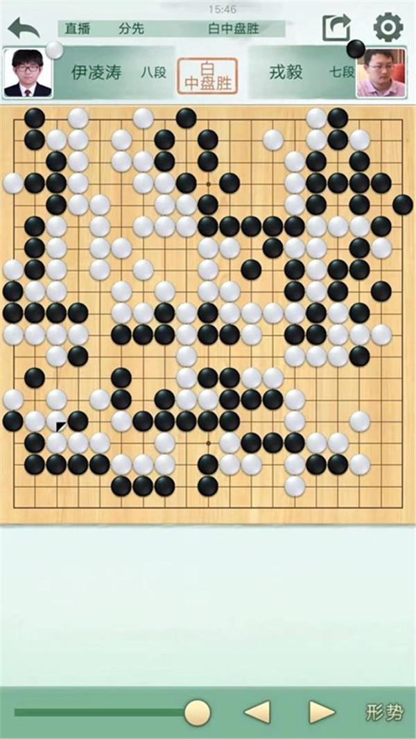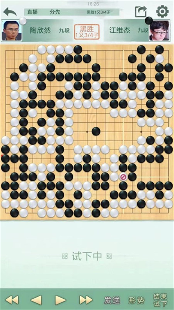 二臺(tái)陶欣然執(zhí)白主將對(duì)陣世界冠軍江維杰。開(kāi)局白有利,左邊白棋進(jìn)攻黑棋時(shí)候手法過(guò)于松緩,局面接近。之后白棋中央又出現(xiàn)緩手黑棋領(lǐng)先。之后右上白棋主動(dòng)開(kāi)劫,但是劫材處理失誤,局面惡化。之后黑棋稍有退讓保持小勝。
