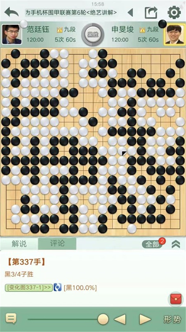 一臺(tái)申旻俊執(zhí)黑對(duì)陣世界冠軍范廷鈺。開(kāi)局下邊白棋攻擊手法不當(dāng),黑處理好后局面領(lǐng)先。中盤(pán)黑棋在左邊計(jì)算精準(zhǔn),下出絕妙手段,在白棋空里出棋后優(yōu)勢(shì)擴(kuò)大,之后黑棋穩(wěn)扎穩(wěn)打?qū)?yōu)勢(shì)保持至終局獲勝。