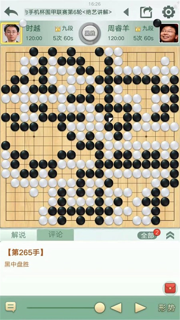 四臺(tái)時(shí)越執(zhí)白對(duì)陣世界冠軍周睿羊。中盤(pán)白棋侵消黑棋左上大模樣,黑棋付出很大代價(jià)強(qiáng)殺形成打劫。白棋劫爭(zhēng)中不夠細(xì)膩沒(méi)有擴(kuò)大戰(zhàn)果而是聯(lián)絡(luò)成活,局面白稍有利。之后白棋左下連續(xù)下出緩手后局面接近。右下角黑棋二路夾試白應(yīng)手時(shí)白棋嚴(yán)重失誤,被黑棋奪走角地后局勢(shì)逆轉(zhuǎn)。