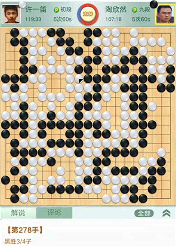 陶欣然執(zhí)黑對陣新初段許一笛。開局下邊黑棋稍虧,之后在左下角獲得便宜黑棋領(lǐng)先。大官子黑棋有所失誤局勢又是白好。之后小官子時(shí)候白棋又有失誤,黑棋幸運(yùn)的3/4子獲勝。