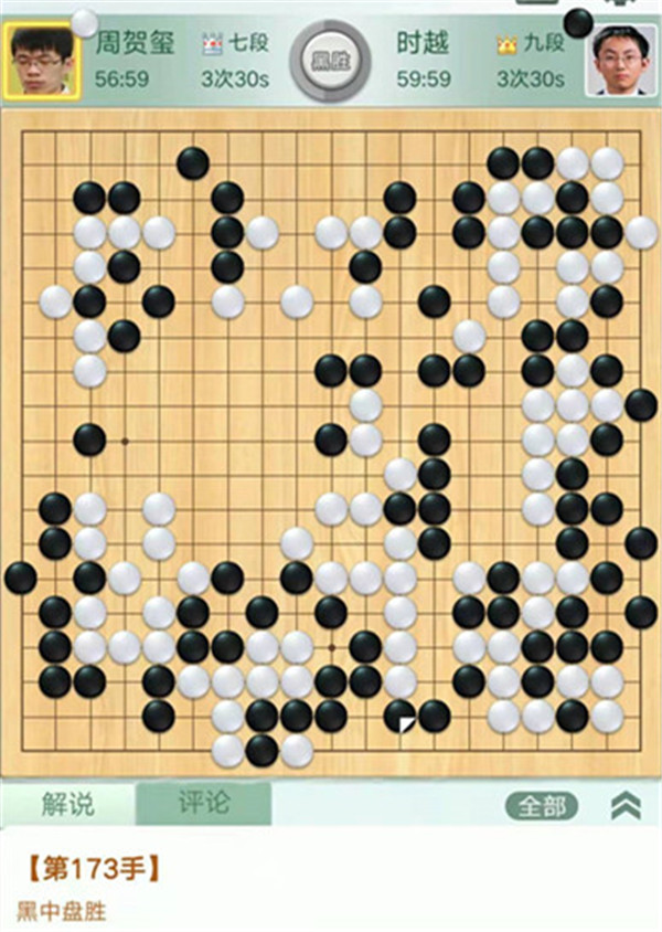 時(shí)越快棋執(zhí)黑對陣周賀璽。中盤黑棋在右邊沖擊白棋時(shí)候,白棋沒有下出一路立的妙手,而是選擇了做劫,劫爭轉(zhuǎn)換后黑棋全吃右邊大棋,已成勝勢。之后黑棋又在下邊白空出棋再活出一塊,中盤獲勝。
