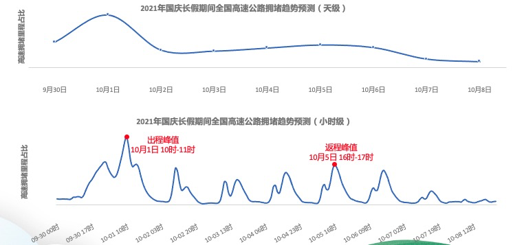 《預(yù)測》顯示,受國慶假期高速免費通行以及出行需求集中的影響,預(yù)計2021年9月30日13時開始,全國高速交通壓力將逐漸增大,21時 -10月1日1時全國高速會有短時出行小高峰,10月1日9時 -12時為高速出程高峰時段,峰值將出現(xiàn)在10時 -11時。