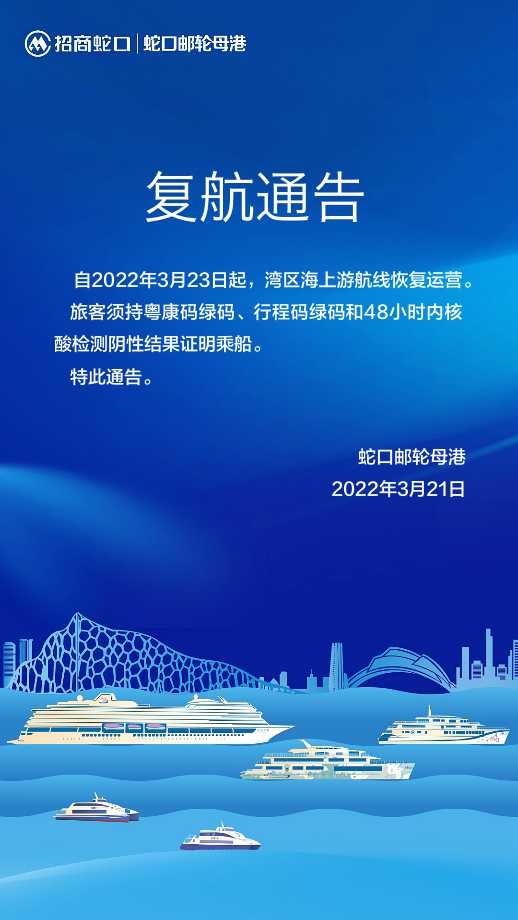 讀特客戶端 ·深圳新聞網(wǎng)2022年3月21日訊(記者 田志強(qiáng))記者從招商蛇口郵輪母港獲悉,自3月23日起,灣區(qū)海上游航線恢復(fù)運(yùn)營(yíng)。搭乘該航線的旅客須持粵康碼綠碼、行程碼綠碼和48小時(shí)內(nèi)核酸檢測(cè)陰性結(jié)果證明乘船。