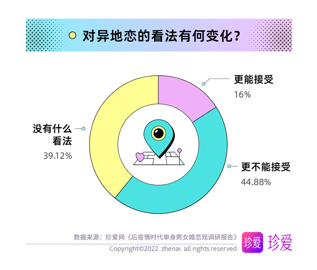 疫情期間的所見(jiàn)所聞使得單身青年們對(duì)戀愛(ài)模式有了不同的看法,調(diào)查發(fā)現(xiàn),近五成(44.88%)的人表示更不能接受異地戀了;僅16%的人表示更能接受。女性(50.8%)比男性(30.64%)更不能接受異地戀。
