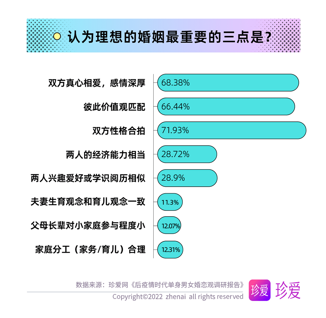 經(jīng)歷過(guò)疫情后,居家期間的家庭生活或他人的故事也令單身青年們對(duì)婚姻有了新的理解,調(diào)查顯示,理想的婚姻最重要的因素為彼此性格合拍(71.93%),高于雙方真心相愛(ài)(68.38%)和兩人的價(jià)值觀匹配(66.44%)。