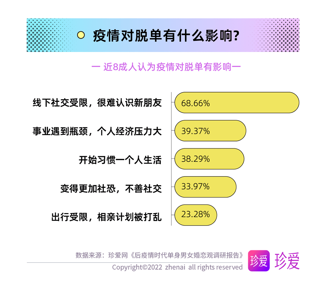 多數(shù)人都更渴望愛(ài)情,但疫情也對(duì)脫單進(jìn)程產(chǎn)生了一定影響。報(bào)告顯示,近八成人認(rèn)為疫情對(duì)脫單有影響,其中首要影響為線下社交減少導(dǎo)致很難認(rèn)識(shí)新朋友(68.66%),其次為日常出行受限因此相親計(jì)劃被打亂(39.37%),此外還有開始習(xí)慣一個(gè)人生活、事業(yè)遇到瓶頸導(dǎo)致的個(gè)人經(jīng)濟(jì)壓力大、更加“社恐”等影響。
