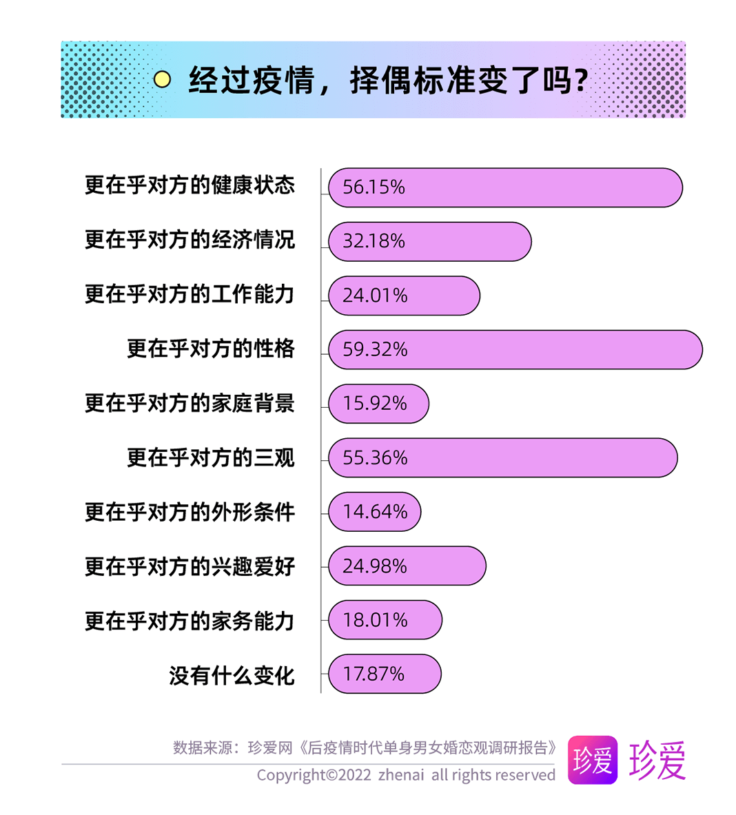 人們的生活方式和心態(tài)因疫情影響有或多或少的改變,而單身青年們的擇偶標(biāo)準(zhǔn)也在發(fā)生著變化,調(diào)查顯示,經(jīng)歷過(guò)疫情,單身青年們更在乎的擇偶條件包括對(duì)方的性格(59.32%)、健康狀態(tài)(56.15%)和三觀(55.36%),對(duì)方的經(jīng)濟(jì)情況、興趣愛(ài)好、工作能力以及家務(wù)能力也是考量的重要標(biāo)準(zhǔn)。
