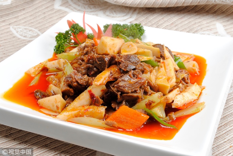 6、坐鍋熱油,爆香蒜末、姜末、紅椒碎,下入春筍粒,略翻炒;下入黑木耳,加適量鹽,翻炒片刻;加入腌制好的豬肉碎,用鍋鏟將肉碎快速翻散,與其它食材一起翻炒片刻,下入雞蛋碎,加適量生抽、老抽,加一點(diǎn)高湯或溫水,燜片刻,待湯汁快要收干,即可起鍋裝盤。(可以單獨(dú)做菜,也可以是粉、面的蓋澆炒碼)