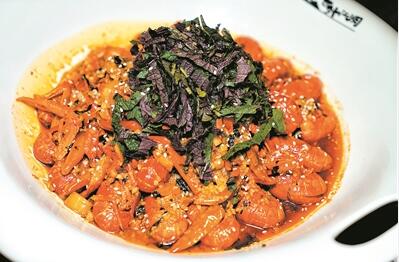 廚師用了特別從湖南長沙選來的紫蘇,在碗底鋪上一層,再將炒制過的小龍蝦放上,最后于蝦面上多撒一層紫蘇,吃時拌起,紫蘇的香氣充分融入蝦身,風(fēng)味獨特。