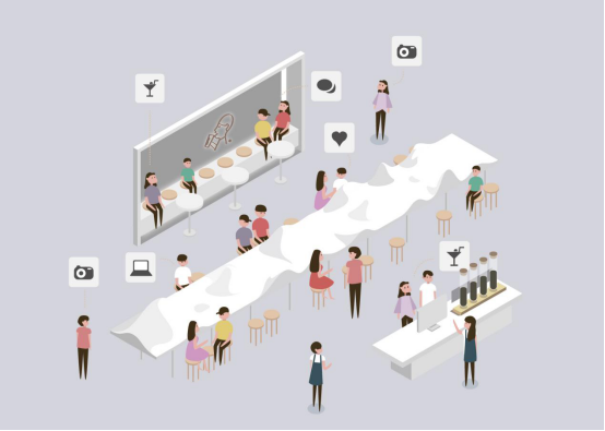 桌面上不規(guī)則隆起的山丘,則在功能區(qū)上區(qū)隔了不同的茶客,小山丘自然的讓人們選擇適合自己需求活動的區(qū)域,這也是多種社交方式并存的明證:在喜茶的空間里,你可以“一人小憩”,或“三兩成群”,或“選擇相遇”。
