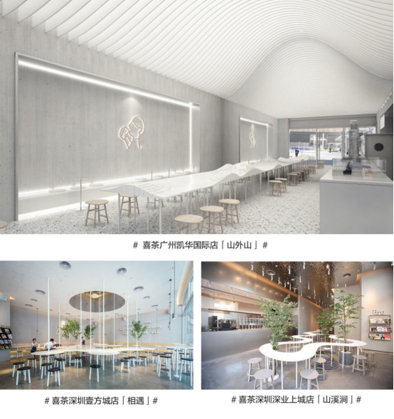店中的桌子做成浮云形狀,山成為桌子的一部分,與天頂?shù)纳叫伟咨⌒雾斉镞b相呼應,“山外山”主題呼之欲出。喜茶·山外山的設計靈感來源于兩幅古畫——《春山瑞松圖》和《溪山行旅》。設計師把畫中的“山峰”感融入店內(nèi),現(xiàn)代化的同時富有詩意。讓茶客仿佛置身畫中,大夢一場,不知身在何方。