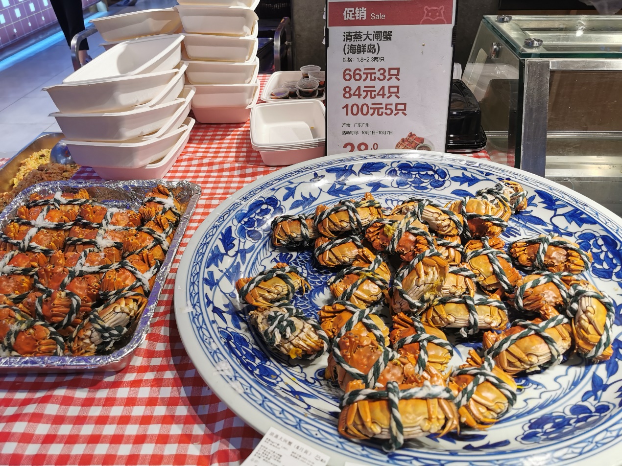 其中爆款非大閘蟹莫屬。民間有個講究:“九雌十雄”,農(nóng)歷九月吃母的大閘蟹,農(nóng)歷十月吃公的,因?yàn)槟菚r候大閘蟹的蟹黃和蟹膏是最好的。黃金周期間,盒馬深圳大閘蟹銷量與9月相比增長六倍。其中最受歡迎的是2兩重的母蟹,盒馬皇庭廣場店假期里試過一天賣出近兩千只大閘蟹。