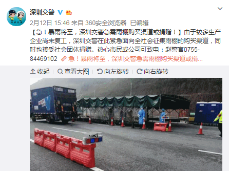 見圳客戶端·深圳新聞網(wǎng)2020年2月14日訊 2月12日下午約4時(shí),深圳交警官方微博的一條消息牽動(dòng)了深圳紅牛負(fù)責(zé)人張健明的心。該微博寫道:“急!暴雨將至,由于較多生產(chǎn)企業(yè)尚未復(fù)工,深圳交警在此緊急面向全社會(huì)征集雨棚的購(gòu)買渠道,同時(shí)也接受社會(huì)團(tuán)體捐贈(zèng)。”