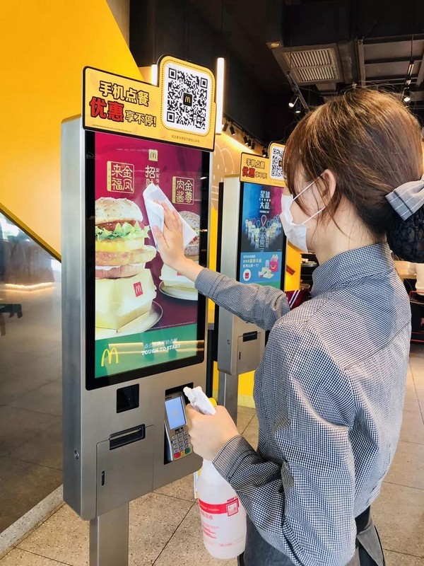 目前全國所有的麥當(dāng)勞餐廳啟動(dòng)上班員工測(cè)溫流程,并提高員工洗手消毒頻次,全國餐廳全員佩戴口罩。在餐廳為顧客提供免洗洗手液,對(duì)所有餐廳的通風(fēng)系統(tǒng)和顧客常接觸的設(shè)施,強(qiáng)化消毒并增加頻次,包括大門把手、自助點(diǎn)餐屏、樓梯扶手、柜臺(tái)臺(tái)面、取餐區(qū)、桌椅、餐盤、兒童椅、兒童樂園等。
