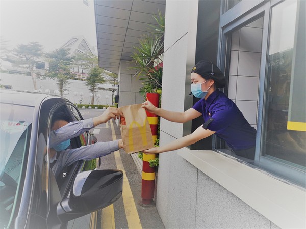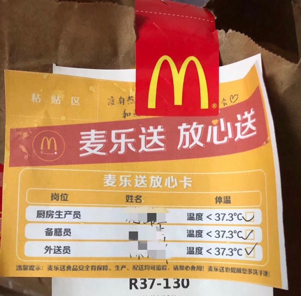 為了讓顧客放心,麥當(dāng)勞在安全服務(wù)的前提下,餐廳實(shí)施“無接觸配送”和“無接觸到店取餐”。所有外送訂單均附上“麥樂送放心卡”,標(biāo)注生產(chǎn)、配膳、外送人員姓名及體溫,做到餐品、人員可追蹤。顧客可選擇讓外送員將餐品送到指定位置取餐,在手機(jī)、餐廳自助點(diǎn)餐機(jī)或柜臺(tái)點(diǎn)餐后,無論堂食或外帶,員工都會(huì)將制作好的餐點(diǎn)裝入打包袋并封口,放置到取餐處。