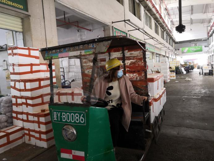市場(chǎng)的檔主、物流車司機(jī)、加工工人,全部都帶上口罩,看新聞講跟人講話要保持距離,但忙起來真顧不了那么多,大家都在“搶貨”,這頭跟檔主商量好,那頭貨可能被拉走了?!柏浺阶约旱募庸ぶ行?,才算是你的。”因?yàn)榇汗?jié)批發(fā)市場(chǎng)的檔口工人回去一大半了,沒人送貨,緊張的時(shí)候,有女同事干脆自己借一輛三輪車,把談好的貨源直接拉走。