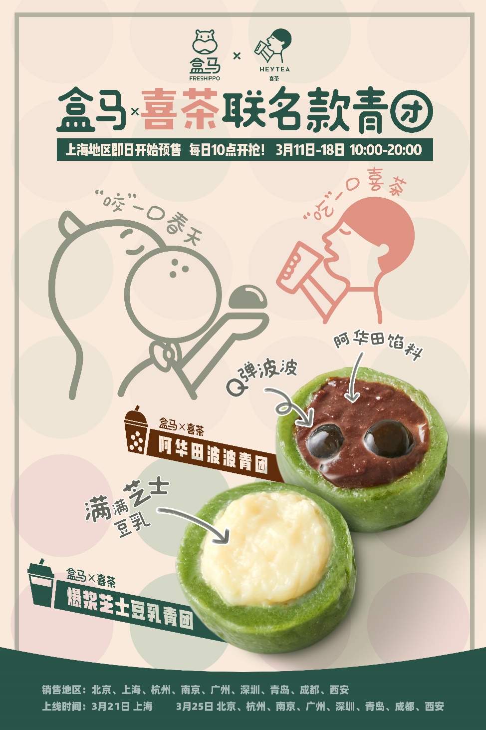 據(jù)了解,盒馬×喜茶聯(lián)名青團于3月11日開啟上海地區(qū)的預(yù)售,3月21日將正式上線。北京、杭州、南京、廣州、深圳、青島、成都、西安等地將于3月25日上線,屆時消費者可通過盒馬線上下單,30分鐘就能吃上春天的味道。