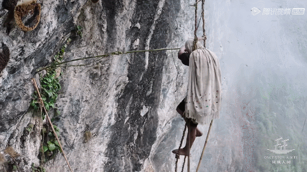 上百米的懸崖,工具卻再簡(jiǎn)單不過。獵人點(diǎn)燃枝葉對(duì)抗喜馬拉雅巨蜂,還要小心不能讓火引燃藤梯。