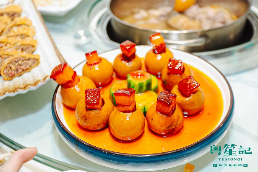 粵笙記陳皮菜式種類豐富且菜式新穎,除了“新會陳皮花膠鴨”之外,入口即化卻不膩口“新會柑橘紅燒肉”、外脆里嫩的“紅燒陳皮乳鴿”、酥香味美的“匠心陳皮骨”、開胃甜蜜的“陳皮番茄”,還有小時候的回憶“陳皮缽仔糕”,這些特色陳皮菜肴都不容錯過。