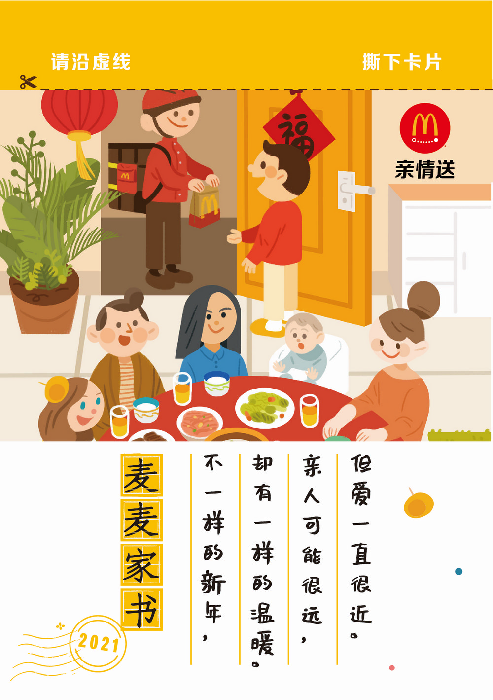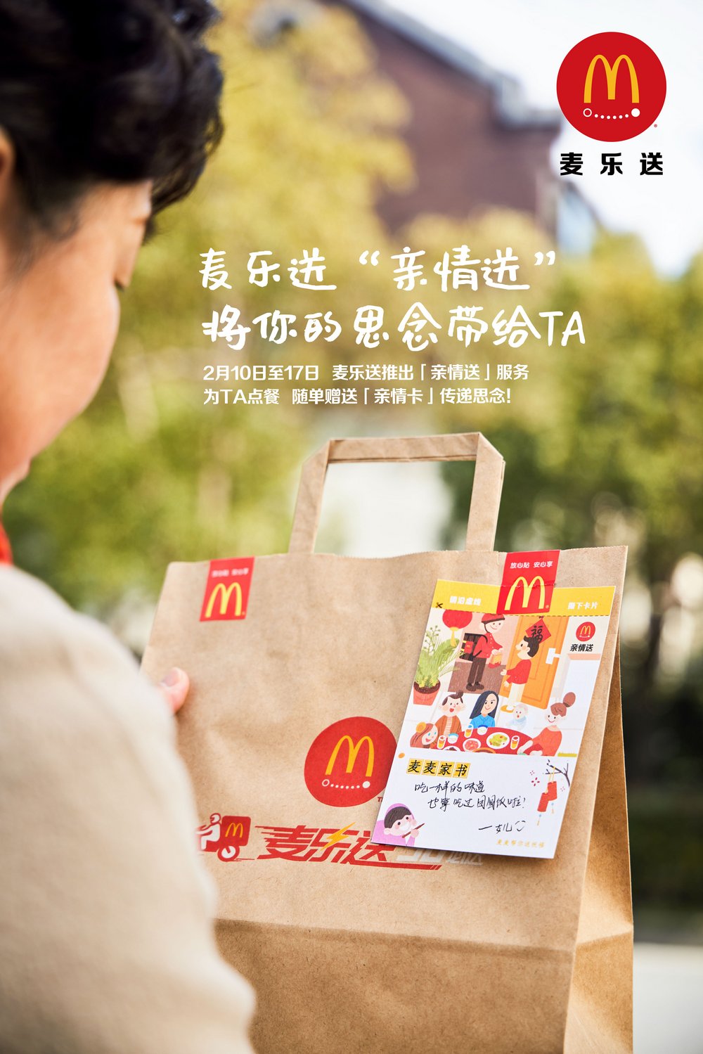 為了讓分隔兩地的顧客表達對彼此的思念和祝福,麥樂送于春節(jié)期間推出“親情送”服務(wù)。2月10日至2月17日,在i麥樂送小程序、麥當(dāng)勞App、美團麥當(dāng)勞店鋪、餓了么麥當(dāng)勞店鋪,顧客可以選擇“親情送”服務(wù),為遠在異地的親人朋友點餐,麥樂送會在訂單中附上【親情卡】,消費者可以定制祝福,卡片連同美食將一齊送達你思念的人手中。