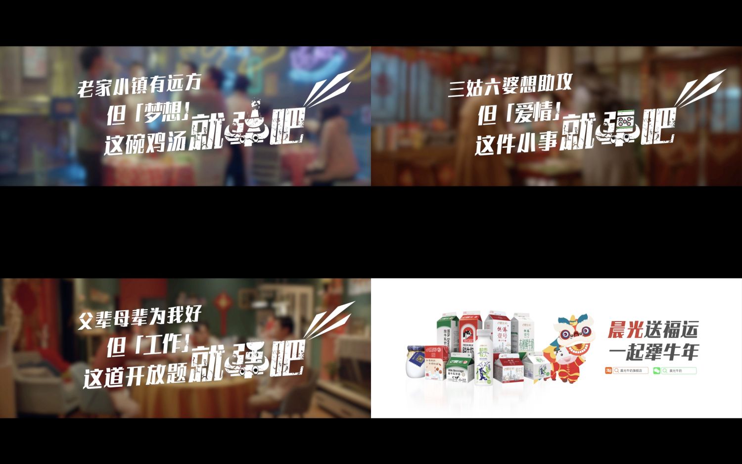 1月29日,晨光乳業(yè)《就犟吧》賀歲TVC微信、朋友圈正式上線,就春節(jié)熱門話題“結(jié)婚、找穩(wěn)定工作、要不要外出追夢”進行了生動演繹。在熱鬧喜慶的年節(jié)氛圍中,趣味反轉(zhuǎn)的劇情,形象展現(xiàn)了新一代年輕人對于工作、愛情、夢想“不服輸、敢堅持”的態(tài)度。