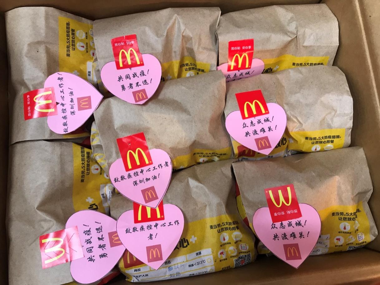 深圳麥當(dāng)勞“麥麥義工團(tuán)”小伙伴們向鹽田疾控中心防疫工作一線的醫(yī)護(hù)人員贈(zèng)送愛心餐食