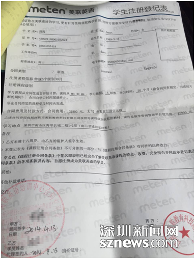 段女士告訴記者,2014年她在網(wǎng)上與美聯(lián)英語的客服人員取得聯(lián)系后,便前往南山區(qū)海印長城二期1-2層的美聯(lián)英語中心試聽課程,并于當年4月報讀了M0—M4五個級別共31800元的課程。段女士當時選擇的是分期付款方式,在完成首付3200元后,其余的金額由銀行每月自動扣除1100余元。截至目前,段女士已連續(xù)繳費22個月。