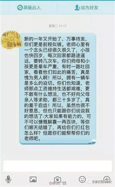 爆料帖中同時上傳了多張聊天記錄,其中一張顯示:“新的一年又開始了,萬事待發(fā),你們更是前程似錦。老師心里有個念頭已經(jīng)很久了,小孩也快四歲了,每次回家都路途遙遠,要轉(zhuǎn)幾次車,你們師母和小孩更是暈車嚴重,有時一路吐回家,看看他們?nèi)绱送纯啵媸抢槟腥税?!所以,擁有一輛車是多么的迫切。你們也知道老師那些工資維持生活都很艱難,更不敢有什么想法,也不好向父母親人求助,都三十多歲了,真的羞于啟齒!所以,雖然也很不好意思,但是也只能跟你們說說我的想法了:大家如果有能力的,可不可以慷慨解囊一兩百塊,等你們哪天結(jié)婚了,再給你們打紅包怎么樣?但愿你們能幫幫你們的老師吧?!?/p>
