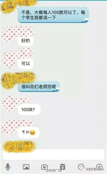 在被曝光的聊天記錄中,該老師曾表示,“大概每人100就可以了,每個學(xué)生我都說一下。”并解釋說,“誰叫你們老師窮呢?”聊天記錄顯示,群內(nèi)多名學(xué)生回復(fù)稱,“可以?!?/p>
