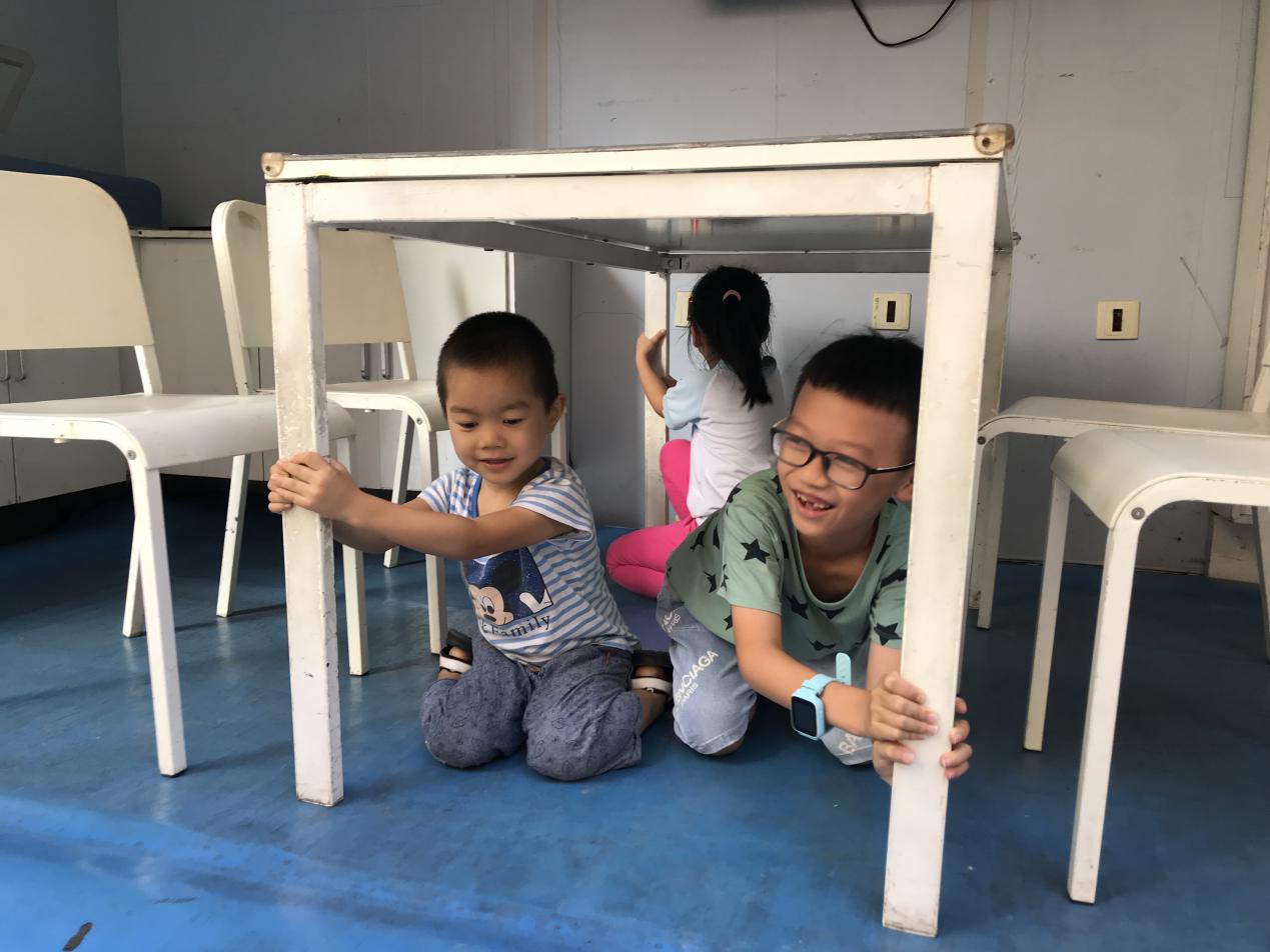兒童平安訓(xùn)練營(yíng)活動(dòng)共有5個(gè)版塊,分別是動(dòng)感地帶、火眼金睛、鐵壁鋼手、浮力盔甲、應(yīng)急包。動(dòng)感地帶活動(dòng)版塊的主體是地震體驗(yàn)平臺(tái),通過(guò)安全教育車(chē)的地震體驗(yàn)功能,社區(qū)居民成功學(xué)會(huì)地震躲避知識(shí)要點(diǎn):規(guī)避易倒塌、易破碎、已墜落三類(lèi)物品;桌下/床下躲避跪、躲、抓三大要點(diǎn)。浮力盔甲是當(dāng)身邊發(fā)生溺水或者存在溺水隱患時(shí),可以利用身邊常用的物品比如礦泉水瓶和衣服制作緊急救生衣。鐵壁鋼手是災(zāi)害發(fā)生、救援難以及時(shí)到達(dá)情況下,利用身邊的物品,對(duì)手臂骨折者進(jìn)行簡(jiǎn)易包扎?;鹧劢鹁κ窃谠S多大地震、火災(zāi)和意外傷害中,教會(huì)學(xué)生認(rèn)識(shí)一些室內(nèi)、室外的常見(jiàn)安全隱患。