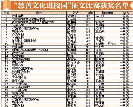 寶安日報(bào)2020年1月2日訊 2019年12月31日下午,寶安區(qū)慈善文化進(jìn)校園征文比賽表彰暨2019年度工作總結(jié)會在寶安實(shí)驗(yàn)學(xué)校會議室舉行。會上對征文比賽獲獎?wù)吆蛢?yōu)秀組織單位進(jìn)行表彰。學(xué)生代表分享慈善故事,學(xué)校代表則分享慈善文化進(jìn)校園經(jīng)驗(yàn)。此次慈善文化進(jìn)校園征文活動是由區(qū)教育局、區(qū)慈善會、寶安日報(bào)社、寶安廣電中心共同主辦,征文主題是“慈善在我身邊”,活動在全區(qū)中小學(xué)生中進(jìn)行征集。經(jīng)過兩個(gè)月的征集和評比,最終評出3個(gè)組別的一、二、三等獎和優(yōu)秀組織單位。