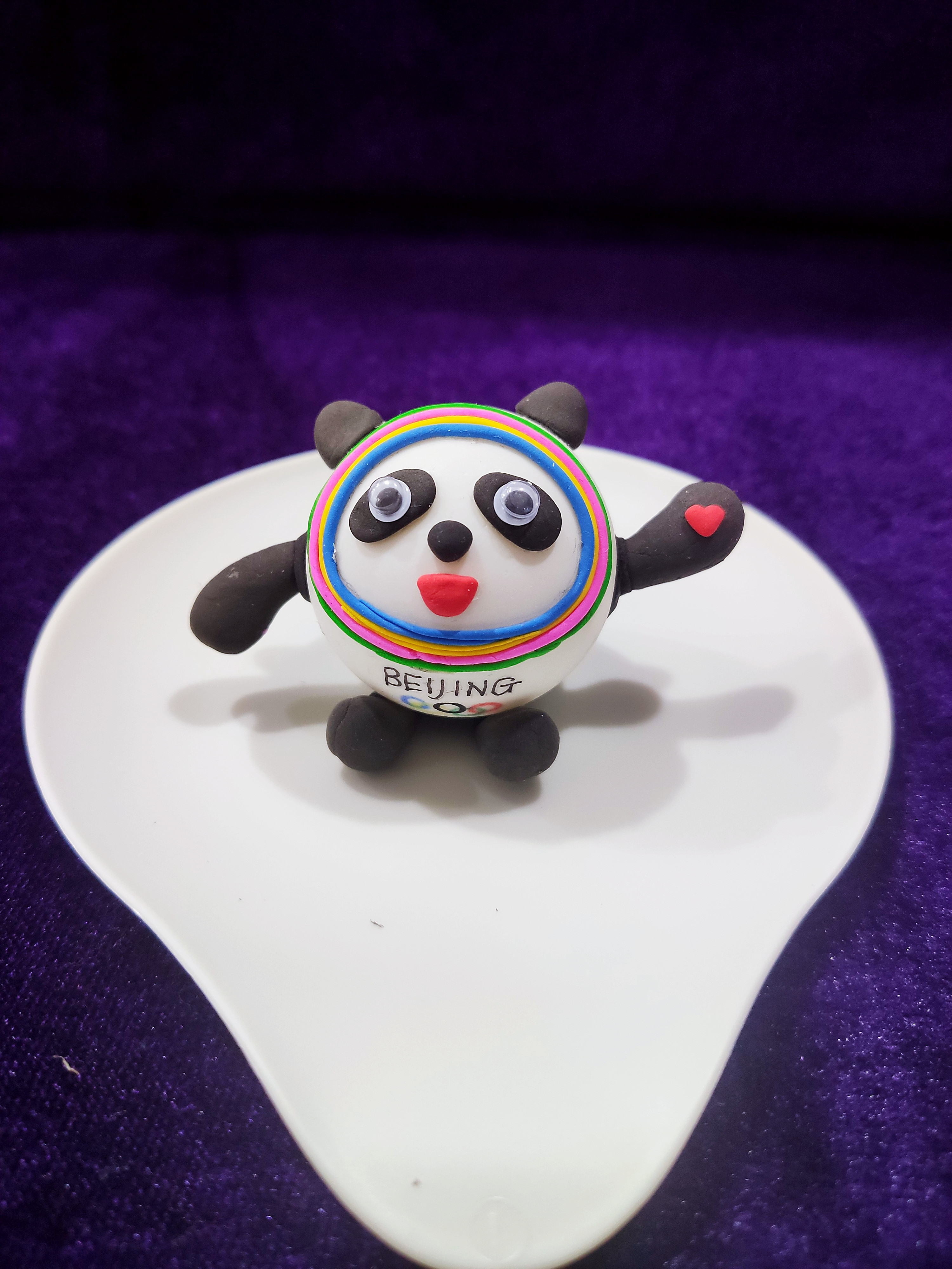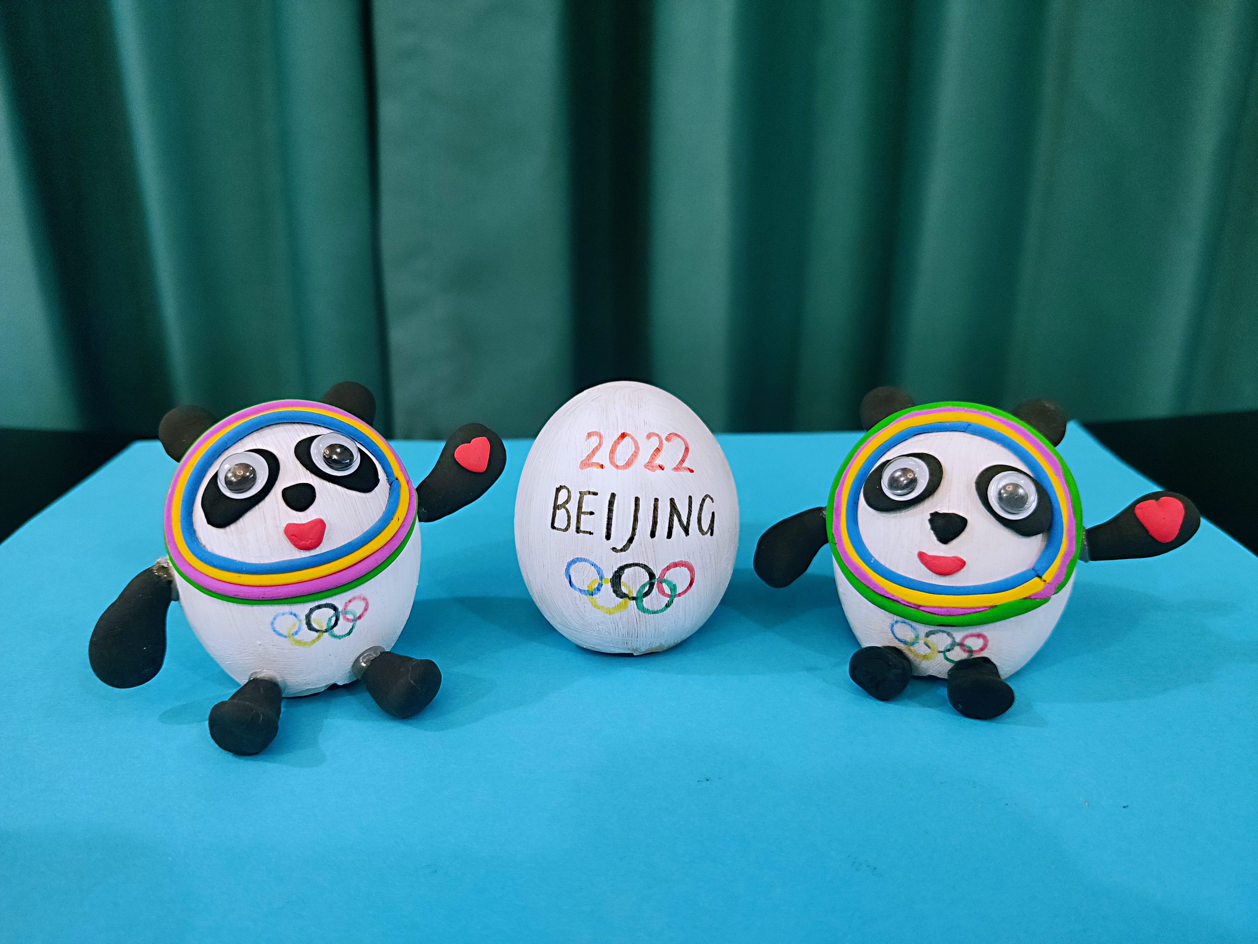 為了不讓蛋殼滾來滾去,我把蛋殼套到了瓶子上,第一步是給蛋殼刷上白色的顏料,晾干,再用輕黏土制作冰墩墩的五官和四肢。制作過程中,我遇到了難題——冰墩墩臉上的彩色光環(huán)可怎么做?我到到網(wǎng)上仔仔細(xì)細(xì)地觀察了冰墩墩的光環(huán),想到了解決辦法,最后我的蛋殼冰墩墩做好了。