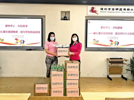 近日,光明區(qū)馬田小學六(3)班羅心如家長向?qū)W校捐贈口罩1000只、消毒液200瓶等愛心物資。