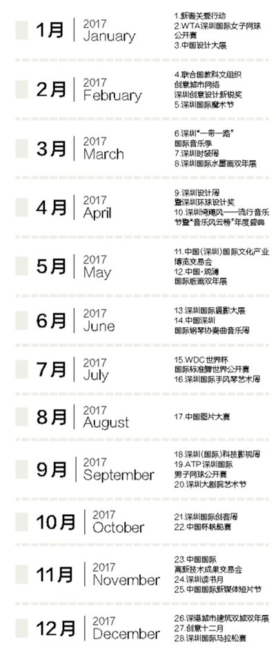 文化是一座城市的魅力與靈魂。必須承認(rèn),盡管深圳這座城市文化發(fā)展取得了很大進(jìn)步,但同時(shí)也應(yīng)該看到,與建成現(xiàn)代化國際化創(chuàng)新型城市的要求、市民日益增長的精神文化需求以及國內(nèi)外先進(jìn)城市相比,還存在不少薄弱環(huán)節(jié),其中一大短板就是國際化、標(biāo)志性的品牌文化活動(dòng)還不多。比如,倫敦大型常設(shè)性文化節(jié)慶活動(dòng)多達(dá)200個(gè),香港有近50個(gè),北京、上海也有20多個(gè),而深圳大概在10個(gè)左右,有國際影響的屈指可數(shù),部分領(lǐng)域只有一些零散活動(dòng),不成體系?;诖耍缭谘芯恐贫ā渡钲谖幕瘎?chuàng)新發(fā)展2020(實(shí)施方案)》的過程中,深圳創(chuàng)新提出建立“城市文化菜單”。從一定意義上說,建立“城市文化菜單”,是城市定位所需,是文化發(fā)展所需,也是市民生活所需,其重點(diǎn)是通過“菜單”的建立,引進(jìn)和培育一批新的國際化、標(biāo)志性的品牌活動(dòng),在活動(dòng)數(shù)量和質(zhì)量上進(jìn)行“雙提升”。