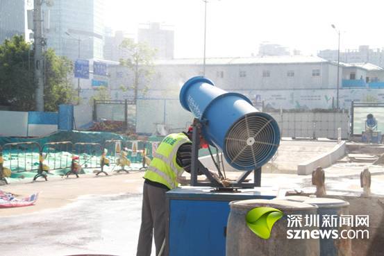 工人操作霧炮機“打”向建筑工地