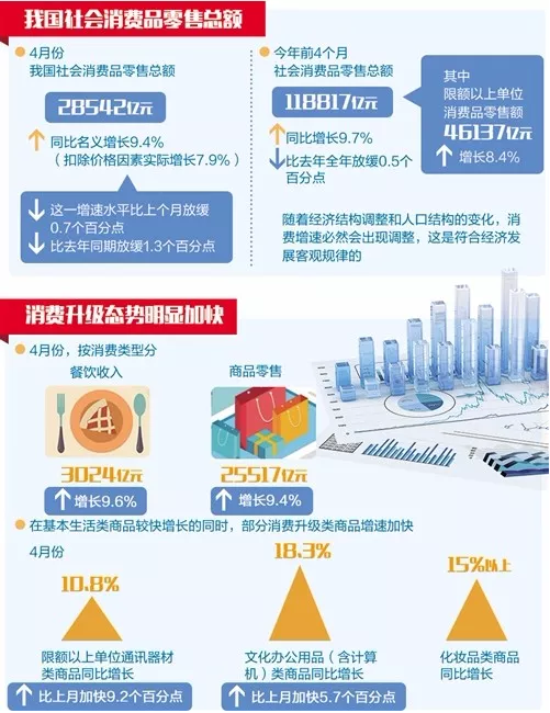 4月份,按消費(fèi)類型分,餐飲收入3024億元,增長9.6%;商品零售25517億元,增長9.4%。