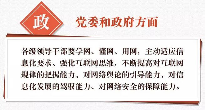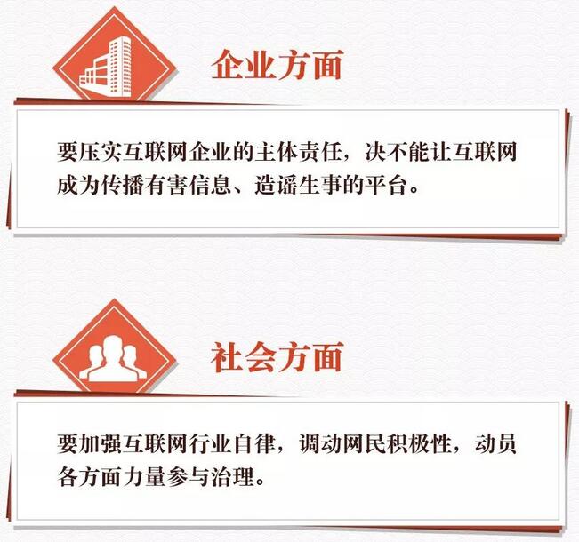 要形成黨委領(lǐng)導(dǎo)、政府管理、企業(yè)履責(zé)、社會監(jiān)督、網(wǎng)民自律等多主體參與,經(jīng)濟、法律、技術(shù)等多種手段相結(jié)合的綜合治網(wǎng)格局。要加強網(wǎng)上正面宣傳,積極培育和踐行社會主義核心價值觀。