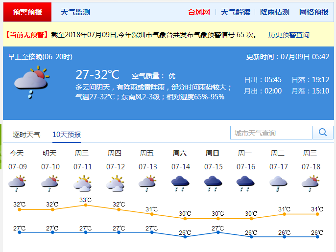 深圳新聞網(wǎng)7月09日訊(記者 何暢)深圳市氣象臺預計,9-10日多云有雷陣雨,部分時間雨勢較大,27-32℃,濕度65%-95%;11-12日天氣酷熱,能見度下降,有灰霾,可能出現(xiàn)局部強對流天氣;13-15日有一次較明顯的降水過程。