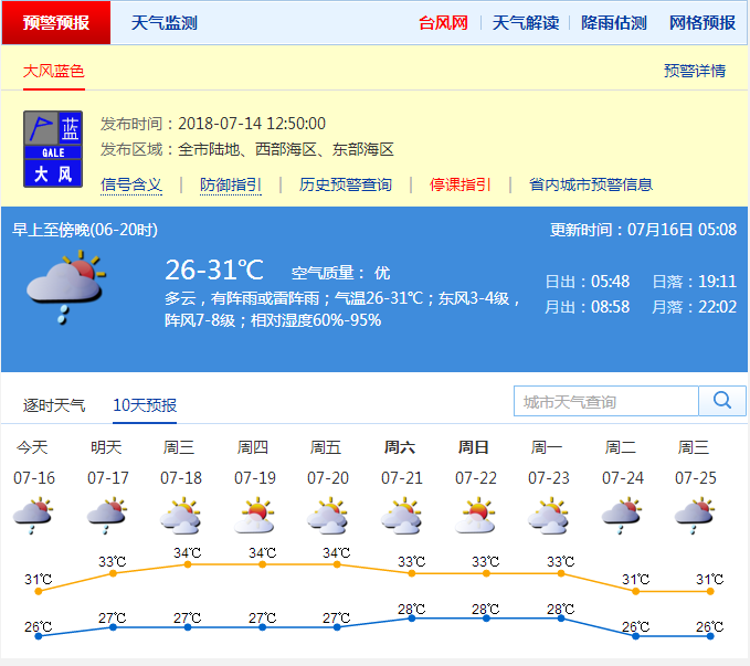 深圳近日降雨天氣增多,16日上午有中到大雨,局部暴雨,伴有7級(jí)左右的偏東大風(fēng),白天降雨逐漸減弱。預(yù)計(jì)17日有陣雨,有時(shí)降雨頻密,18日陣雨轉(zhuǎn)多云;展望19日至22日多云到晴天,天氣趨于炎熱。