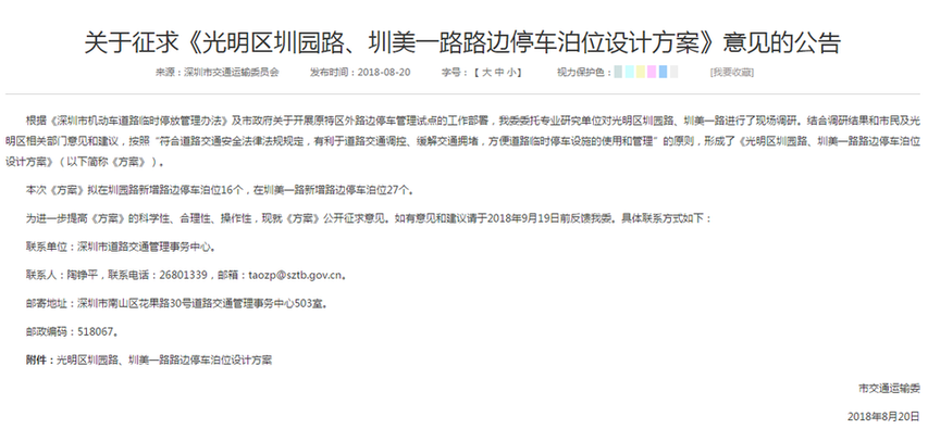深圳新聞網(wǎng)8月20日訊(記者 涂勝)8月20日下午,深圳市交委發(fā)布消息稱(chēng),光明新區(qū)擬設(shè)置“宜停車(chē)”泊位,位于圳園路和圳美一路,共設(shè)43個(gè)泊位。
